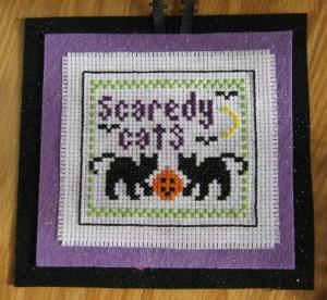 According to the editor of Just Cross Stitch magazine, Halloween is the second most popular occasion to stitch for. I don’t know whether the sample size for this pronouncement includes only readers of this particular publication, or stitchers in general, but that still can’t dissuade me from devouring the annual Halloween ornament issue. My mother decided she liked “Scaredy Cats” by Val’s Stuff, so I stitched it for her: