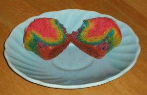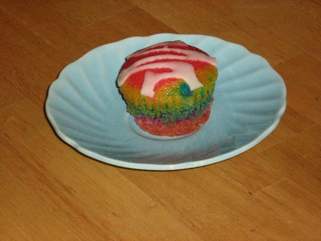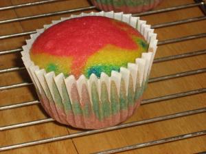 I’ve long been intrigued by the rainbow cakes (“Oh, that explains the title!”) that proliferate various DIY-type sites around the internet. They looked perhaps a little fiddly, albeit not terribly difficult, and ooh…colourful! It was a cool, cloudy, day today, and I decided that a little colour would improve things immeasurably. With my trusty copy of Vegan Cupcakes Take Over the World – the Golden Vanilla Cupcakes recipe, if anyone’s trying this at home – and a few bottles of food colouring, I came up with these (and stained my thumb yellow in the process):
