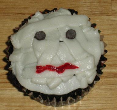 I used a basketweave tip (Wilton #47, I think) to pipe on the bandages. That was tricky! I’m a big fan of symmetry and pattern, and to try to maintain a random order of bandage direction? Killer! The eyes are mini chocolate chips, and the mouth is red gel food colouring applied with a toothpick (my parents’ idea; before they suggested it, my mummies had a bit of a Hello Kitty vibe and no mouth to speak – ha! – of).