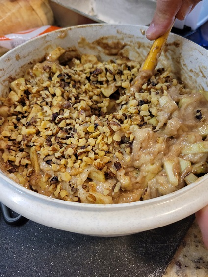 Once he finished up with his A+ dicing, we got the wet ingredients together, added them to my carefully assembled dry ingredients, and folded in the apples and pecans before divvying it up between the pans.