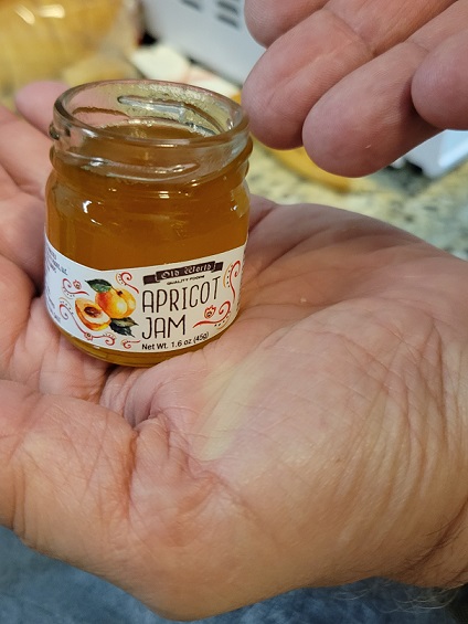 He even had a little jar of apricot jam at the ready to be warmed up in the microwave and brushed over the tops of the loaves. I wasn’t convinced that step was necessary – I just figured it would make things sticky, and I don’t like sticky fingers (apologies to the Rolling Stones). But I’m glad he talked me into it! Look at the difference between the glazed loaf (on the right) and the to-be glazed loaf:
