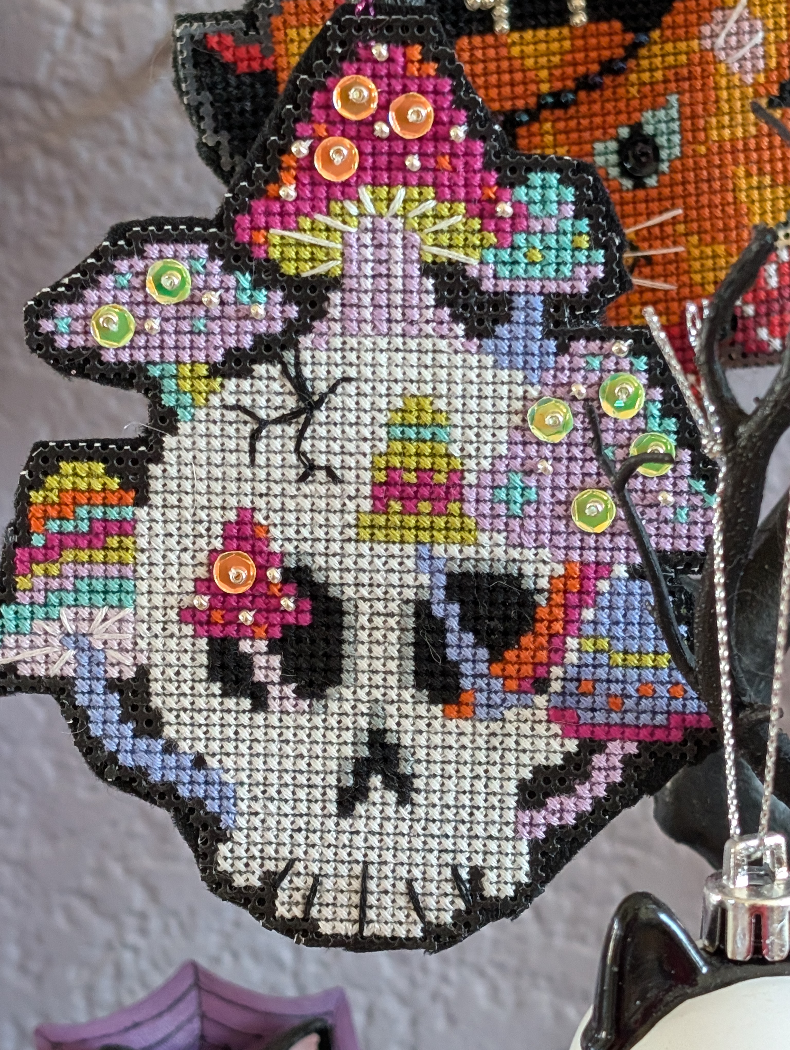 When I was gifted a set of four Satsuma Street Halloween ornament kits a few years back, I jumped (ha!) on Hoppy Halloween, and followed it up with Eye Scream and Haunted Hearse. (The latter’s wordplay messes with my brain, and I can’t hear it without thinking, “Ermagerd, hernted [haunted] hearse!”) That left Fun Guy, whose only crime was being a skull. I like my Halloween cutesy, and anything that reminds me of dead bodies – blood and gore, skeletons, zombies – doesn’t do it for me. That old Disney cartoon with the skeletons scared the bejesus out of me as a kid.