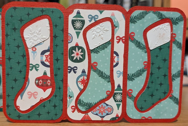 This year, I sent the tri-fold stockings card from the Merry and Bright kit on SVGCuts. They fit perfectly in your standard 18.5 cm x 13.5 cm envelope – that’s 7″ x 5″ for those who don’t speak metric – and were a fun way to mix and match patterns.