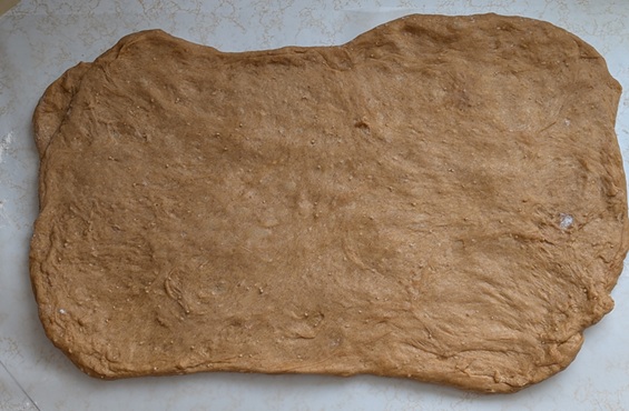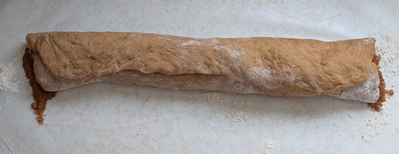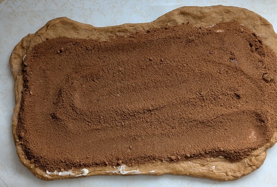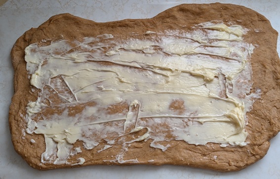 Then quick-quick-quick, stretch your dough out into a rectangle, coat it with butter and your filling, then roll that puppy up.