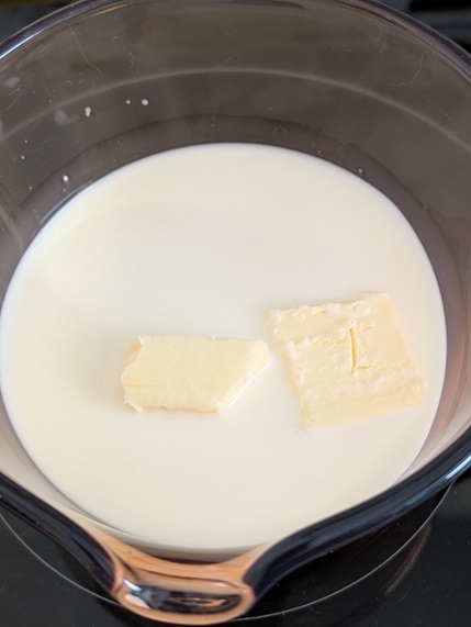 Next up: wet ingredients. Butter in milk, essentially.