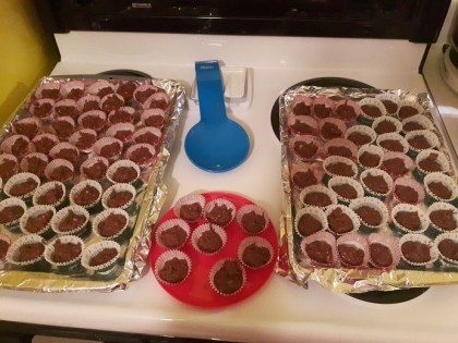 Set out your mini cupcake liners. The recipe I found has a yield of 75, but whoever wrote it must have filled their liners fuller than I do. This may take some experimentation on your part, so keep a few extra nearby. Also, the tinfoil is not strictly necessary, but prevents you having to wash your cookie sheet when you drop chocolate on it – and you will drop chocolate on it.