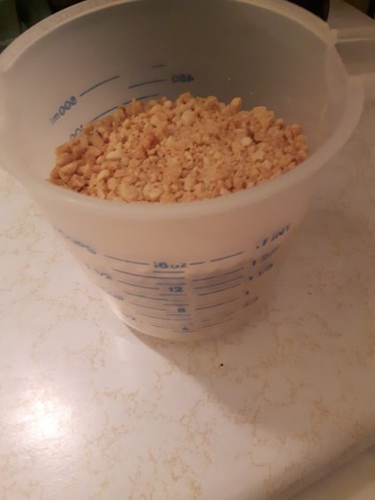 Chop your peanuts and crush your ripple chips. I like to use a mini food processor for the chips, but if you have some holiday rage to work through, a sturdy Ziploc bag and a rolling pin make a wonderful substitute. Set them aside for now.