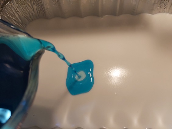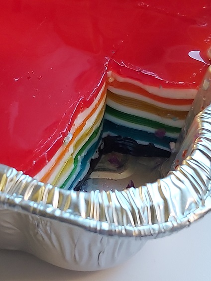 4. Remember the 3″ pan I procured just for this? Holy heck, am I ever glad I had it! That puppy was almost full to the top when I was finished. Oh, and heavy, too! I had decided to store this in the basement fridge for the duration, and had the foresight to realize I didn’t want to have to carry it upstairs each time I wanted to add a new layer. Because there’s no way those soup bowls were going to make it downstairs without spilling, I emptied each one into a 2-cup measuring cup when it was time to add it and took that down instead. (For the white mixture, I measured out my cup-and-a-half in another 2-cup measuring cup.) An added bonus: because my last few colours were gelling even at room temperature, it was easy to pop the measuring cup into the microwave for 20 seconds or so to loosen everything up again.