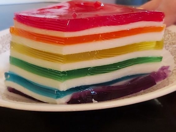 Be aware of the capacity of your kitchen implements. The recipe called for “six small bowls” to mix the Jell-O. I used soup bowls, figuring they’d be more than enough – but by the time I added my one and a half cups of water to each flavour, those babies were full. Ditto the “small saucepan” for warming the milk. Luckily, I decided while the milk was still in the carton that a small saucepan couldn’t hold a litre and sized up. Also: some of the comments complained that all the layers wouldn’t fit into a 9″ x 13″ pan as promised, so I bought a deep (3″) disposable one just for this project.