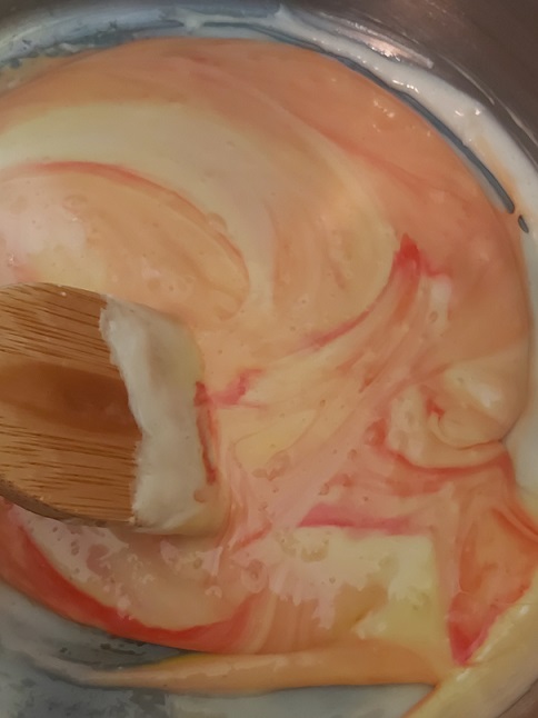 I really dug the tie-dye aesthetic the marshmallow got when I added my red and yellow food colour – if I thought it would stay swirled and separate, I’d try making a batch in a different colour, but even if I hadn’t dutifully blended these to a solid orange beforehand, stirring in the cereal would have done the job.