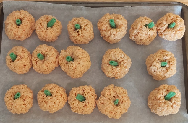 Last year, the employees from the west side of our floor had a bit of a Halloween party and didn’t invite the east-siders. I discovered it by accident when I went to file something and walked into a table covered in sharable finger food. When I ran into one of the west side denizens later on in the shared kitchenette, she bade me come over and grab something to eat. That’s where I first encountered Rice Krispies treats in the shape of pumpkins, and I’ve had to wait a whole year for them to be seasonally appropriate again.
