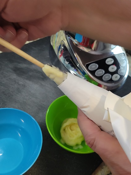 What they don’t tell you, however, is that any pineapple chunks that escaped the blender’s blades will block the piping tip, resulting in more poking with a stick (a chopstick this time, and not a wooden spoon).