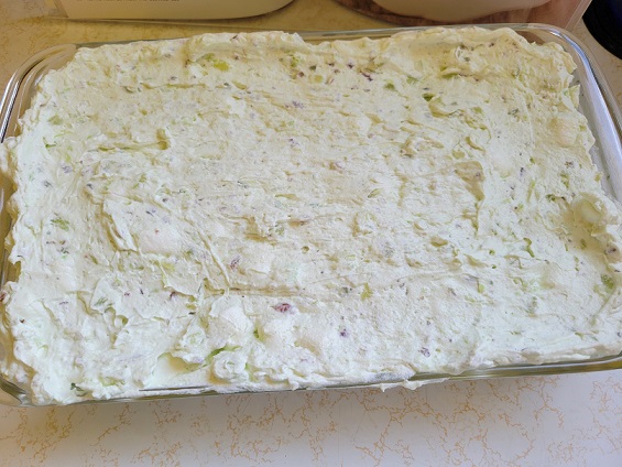 The recipe called for an 8″ baking dish; I went larger than that after looking at how much was in the bowl. (I think my problem might have been a larger container of Cool Whip than the recipe called for, but in my defense it was not labelled as being 8 oz and was also the only size available at the store, so…)