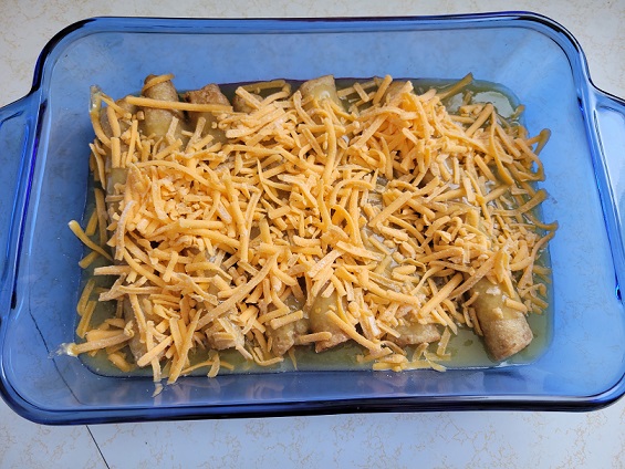 Once your 10 minutes are up, turn them over and pour a can of enchilada sauce over the works. I used verde sauce which admittedly looks a bit nasty in photographs but smells and tastes heavenly. Sprinkle some shredded cheese over the top (my designated shopper brought me old Cheddar), and put them back in the oven for another 10 minutes.