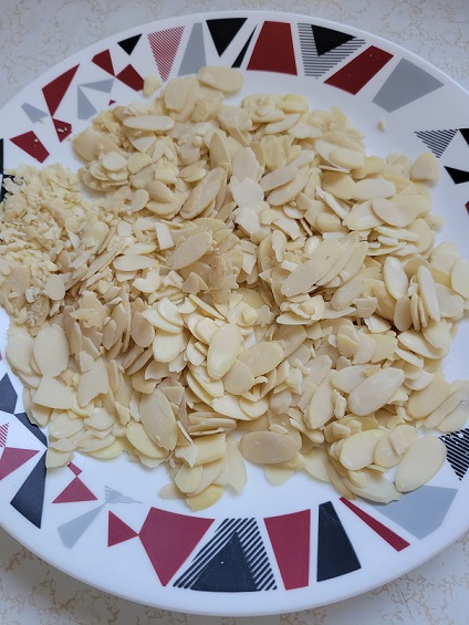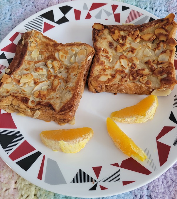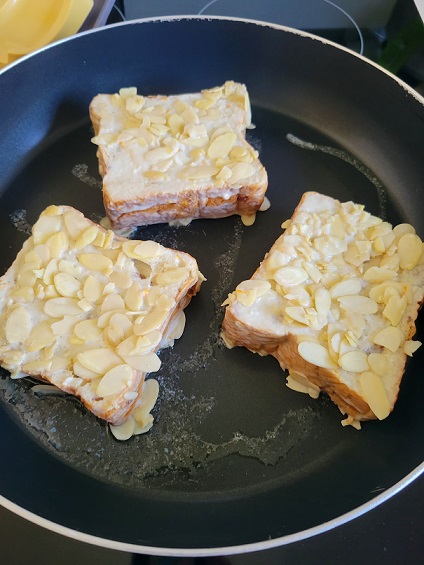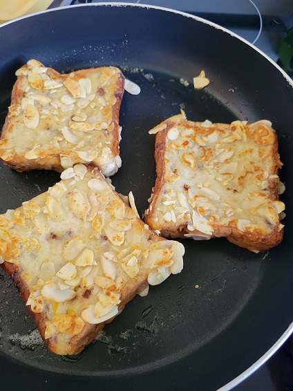 Speaking of unappetizing: there was something a little off-putting about soggy bread with almond slices stuck to it. I got all of my bread dipped and almond-ed while I waited for my pan to heat up, and seriously had my doubts before the first side turned golden brown.