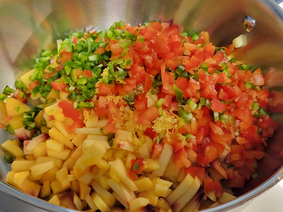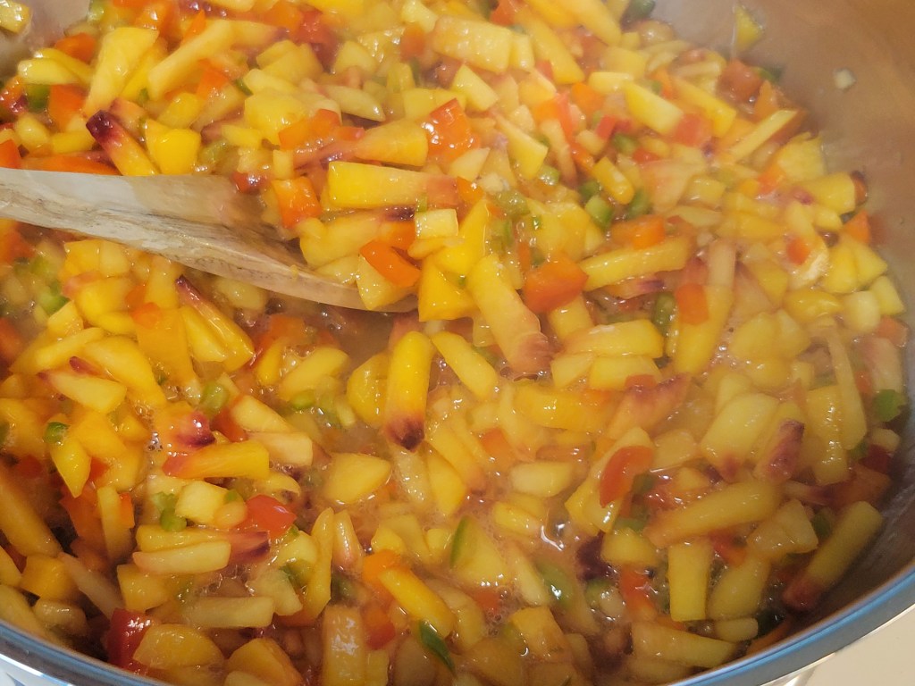It made me think of peach salsa, albeit a deconstructed version, when we first added all our ingredients to the pot. There’s something so appealing about the vivid colours of the produce.