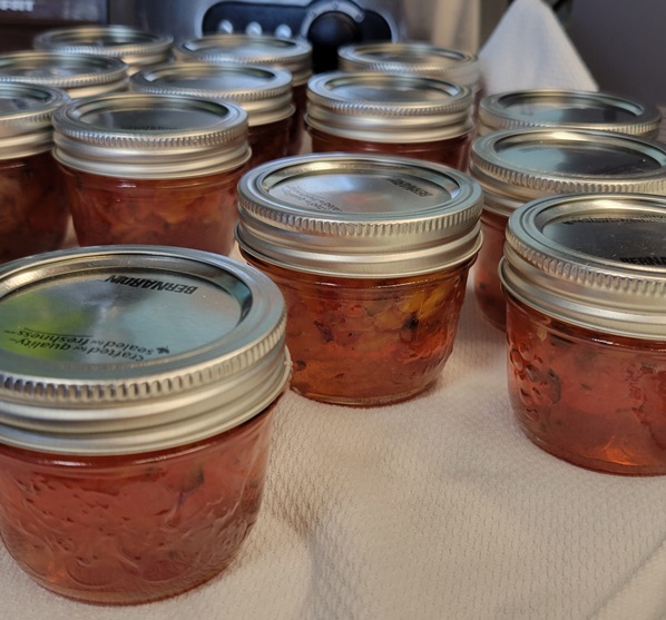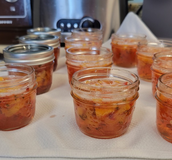 Our finished product had a bit more kick than the jar I had been gifted, making me think the recipe had been tweaked somewhat to include a bit more peach or a bit less pepper – but this is by no means unbearably spicy. We cracked open a jar to try it, and it’s got a sweet-hot zip that should be a hit.