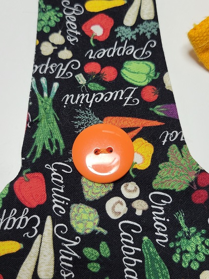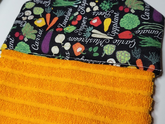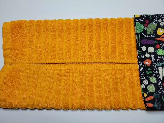 Hey, look, it fits! There’s just a little bit of extra space at the end of my topper, and that’s OK. If you’ve got more than just a little bit, try tugging on your folds gently to make your towel fill the space better. Because these were going to be hanging up as a set, I used the lines on my towel to gauge how much I had inside the topper and how much would hang down, and tried to keep both towels even. If you’re making a single one, go crazy! Well, within reason. I probably had about 2 or 3 cm of my towel up inside the topper to make sure it all got sewn together and there was no risk of it tearing out if someone were to give it a good yank. This is probably a good time to mention that if you like one side of your topper better than the other – maybe it’s got a cooler pattern placement or whatnot – figure that out now, and make that your front. I’m pretty equal-opportunity about my veggies, so however I grabbed it is how it got positioned.