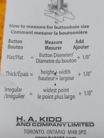 Of course, if I had been just a little less excited about the buttons’ shiny orange-ness, I might have noticed that the card they came on had a handy measuring guide. Spoiler alert: my folksy home-remedy way of sizing worked perfectly here, too, since my buttons weren’t thick or irregularly-shaped.