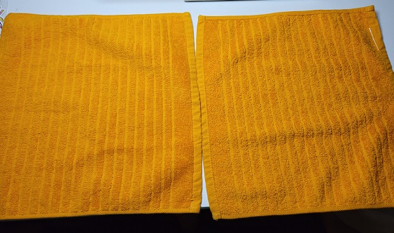 On to the towel part! Normally, I take a single hand towel and cut it in half, but I couldn’t find a hand towel in the colour I wanted, so I opted for two facecloths instead. They’re a bit shorter side-to-side than a hand towel half would be, but work well. (Not pictured: me hacking off the thick hem at the edge that’s going to go inside my topper, because no way was my sewing machine going to get through all that.)