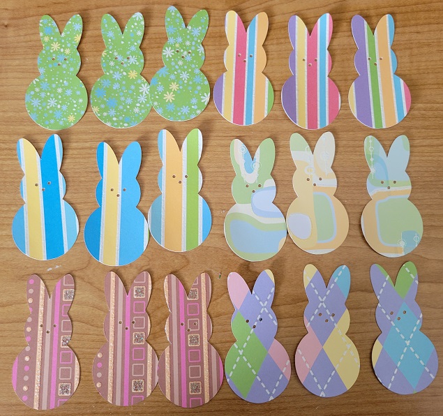 I wound up cutting out six sets of the three bunnies. When I resized the file so that they’d fit on the blank notecards I bought, I discovered they’d fit perfectly on sheets of this glittery cardstock I’ve had for probably the last 15 years. I bought it because it was sparkly and pretty, and then had no idea what to do with it. Also, that much pattern can be a bit much in one big chunk, but in smaller shapes? It works!
