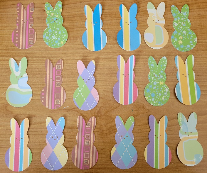 Last year, when I was still essentially scared of playing around with the Silhouette Cameo cutting machine, I had downloaded a file of three bunnies shaped like…well, like those marshmallow candies that are everywhere at this time of year, and with the wording “Hanging With My Peeps”. My friend and I cut out a few repeats of the pattern out of heat-transfer vinyl and made tea towels. I thought about using the file again, but didn’t want to mess around with getting the lettering on straight. Mind you, the bunnies were cute on their own…