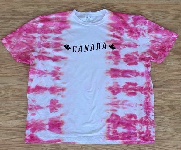 Last summer, Michaels* had included, in one of their daily promotional emails, a link to a tutorial to make a tie-dyed Canada Day t-shirt. My tie-dye buddy and I (he’s also my baking buddy; truly, he’s a jack of all trades) bought white t-shirts and a bottle of red dye, and…never got around to applying one to the other. Whoops.