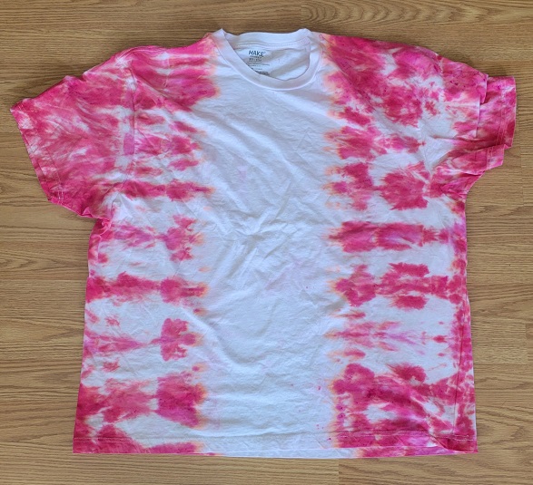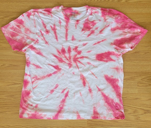 Rinse time! His turned out beautifully, but I should have gotten down into the folds of mine a little bit more with the dye. But I can’t be too upset, for two reasons: 1) if I had wanted a solid red shirt, I would have bought one, and 2) the swirl lines came out well, and don’t look like Christmas candy. I’ll call that a win. If I squint, it looks a bit like a burst of fireworks, which is certainly a propos.