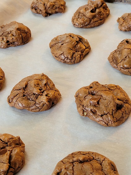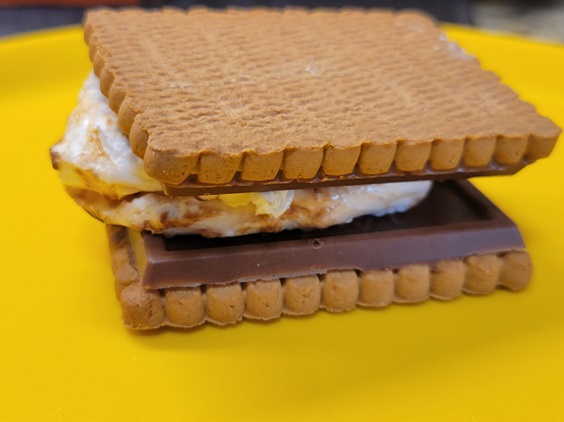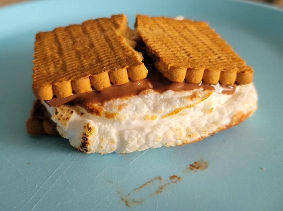 It was a bit of a trick to get them off the fork – once the flame was turned off, they congealed pretty quickly – but two marshmallows made the perfect fluffy layer between our cookies. Unfortunately, because they had cooled a bit, they didn’t melt the chocolate so well…