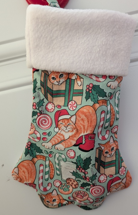 My favourite part – or maybe second-favourite, after the orange cat fabric – is the lining. I found a couple of scrap pieces of green cuddle satin in my stash, left over from a pair of pajama pants, that were just the right size and matched the darker green on the outer fabric admirably. It gives the stocking such a luxe feeling!