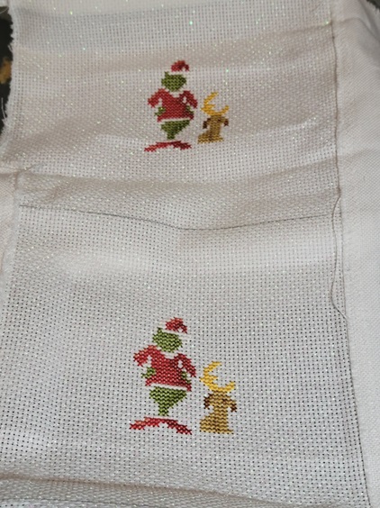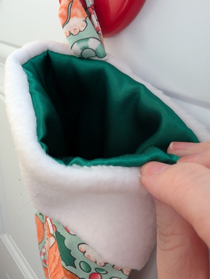 My favourite part – or maybe second-favourite, after the orange cat fabric – is the lining. I found a couple of scrap pieces of green cuddle satin in my stash, left over from a pair of pajama pants, that were just the right size and matched the darker green on the outer fabric admirably. It gives the stocking such a luxe feeling!