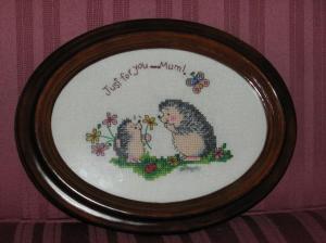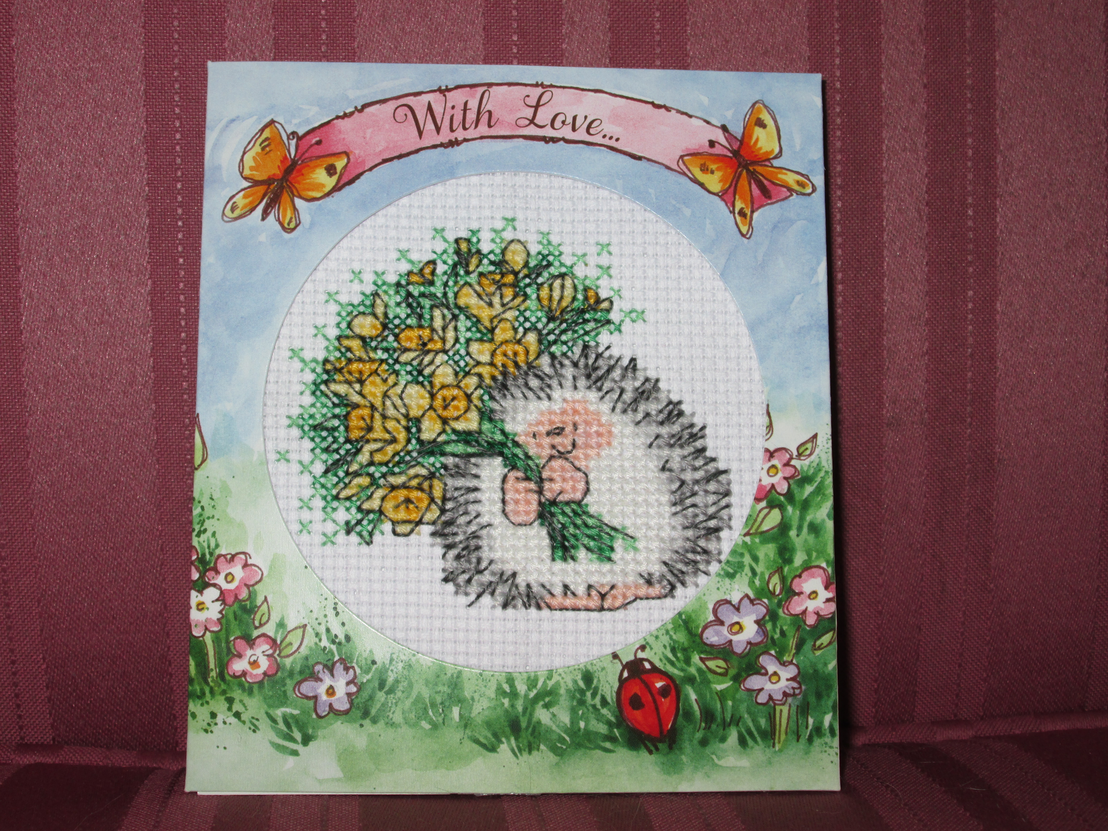 I also had the perfect birthday card in mind: a Margaret Sherry illustration from The World of Cross Stitching a few months back. It features a sweet little mouse presenting his hedgehog friend with a birthday cake.