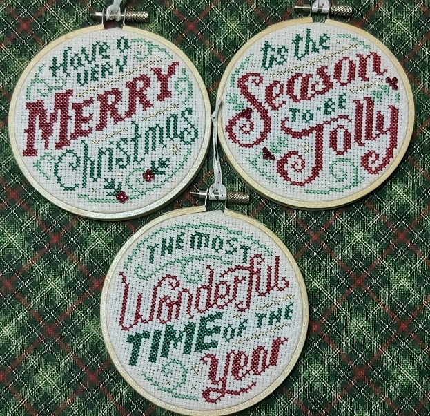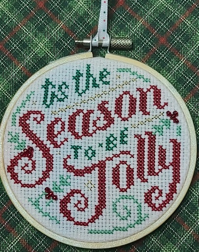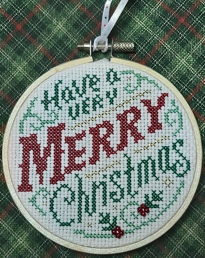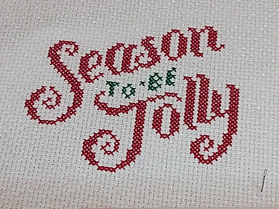 The holly berries were supposed to be red cross-stitches, but I had some beads on hand that worked perfectly. The gold metallic accents were my substitution, too, and worth the frustration of working with metallic thread.