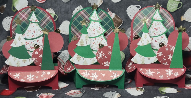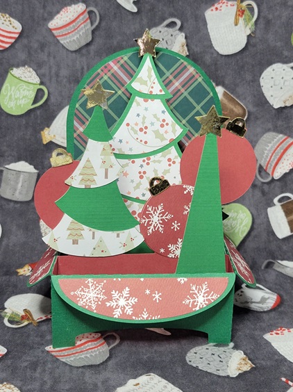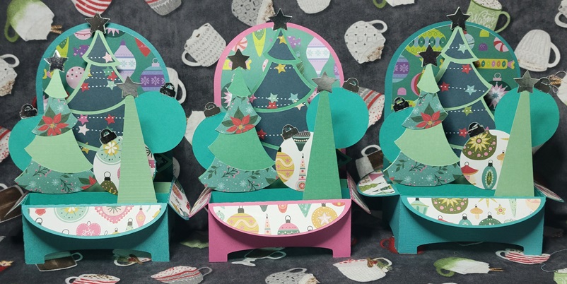 Last year, I kept things fairly simple with a bit of embossing powder and die-cut messages (trust me, it’s simpler than it might sound), but this year I apparently lost all sense of reason when I saw the Christmas Trees box card on SVGCuts. This had presence, drama, and a great reason to play with some fun patterned papers that mysteriously find their way into one’s stash but don’t get used for being “too busy”.