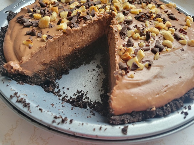 Once the brownie layer cooled completely, I made a chocolate hazelnut mousse to spread on top, and garnished with pieces of toasted hazelnut and chocolate curls. The curls weren’t called for in the original recipe, but while searching the bulk store for nuts I found a bin of curls and thought they’d make a nice addition.