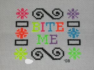 Really, there isn’t anything I could say about this piece that it’s not already saying itself. Oh! Except that it’s for the same lucky, lucky individual for whom I made the “Bite Me” trivet as seen in my maiden post. He got such a kick out of the first piece that I brought my Subversive Cross Stitch book to work to show him, and he started laughing when he saw this one. Knowing his birthday was coming up, I figured I could swing it, and make his day…..twice in just a couple of months. Go me! Without further ado, I present to you: