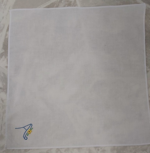 I wanted to send her something back, but what? I like it when crafts can be functional as well as pretty, and somewhere along the line I hit on the idea of a hand-embroidered monogrammed handkerchief. I know the thought of handkerchiefs grosses some people out, but I envisioned this being the perfect accessory for delicately wiping away a tear of joy at a summer wedding, not handling winter-level snotty output. I mean, the handkerchief, at least, won’t fall to shreds after bouncing around one’s purse or being balled up in one’s hot little hand, so there’s that. (This is back when the virus was a problem for other continents, and there was no conceivable reason that there might not be summer weddings. Oh, how I laugh now at my childlike naivete.)
