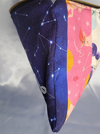 When I got to the fabric store (any excuse for a trip there!) and found the section housing appropriately astrological prints, the designated Capricorn print was pink. Of course. That didn’t stop me buying a bit of it, as well as varying cuts of a few other prints. Nothing said I had to use the pink fabric for the entire pouch, right? Maybe I could combine them somehow. Sewing is one thing, but I’m not a quilter, a planner-of-attaching-pieces-to-other-pieces. I let my fabrics languish for a while (this is very much the approach I took to my t-shirt quilt, albeit over a shorter time frame), and started cruising the internet again.